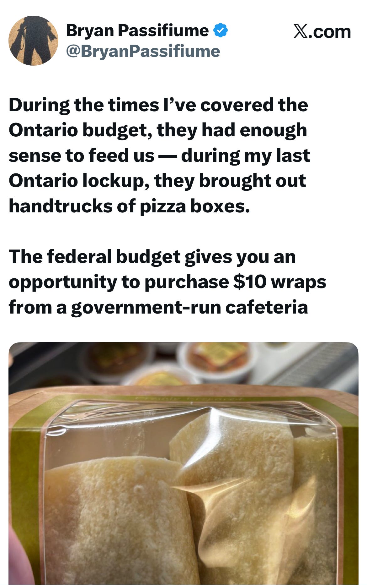 Perhaps as an unintended metaphor for CBC’s growth at private media’s expense, Postmedia’s Brian Passifiume illustrated his relative poverty by jocularly complaining about the lack of a free lunch for those within the budget lockup.